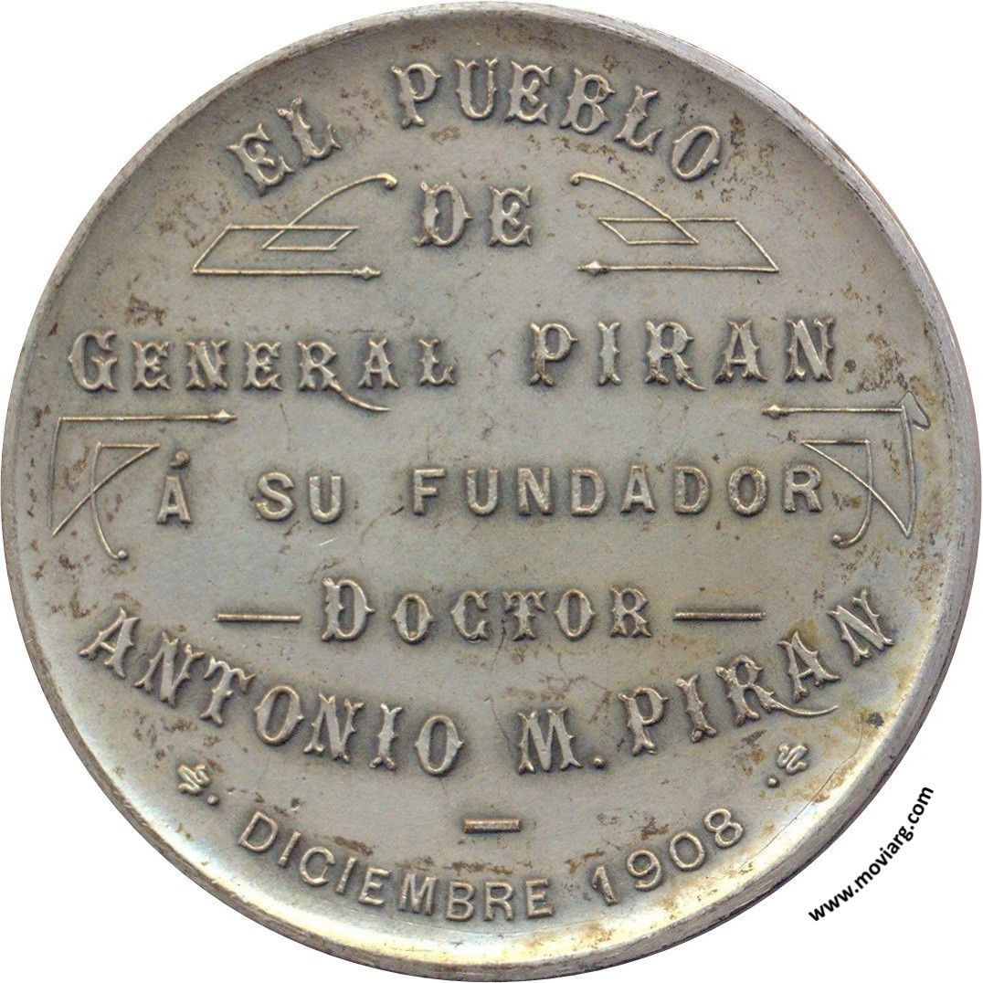 Anverso: GENRAL. PIRAN. Firma: BELLAGAMBA / Y ROSSI Reverso: EL PUEBLO / DE / GENERAL PIRAN / Á SU FUNDADOR / DOCTOR / ANTONIO M. PIRAN / DICIEMBRE 1908 Referencia: | |