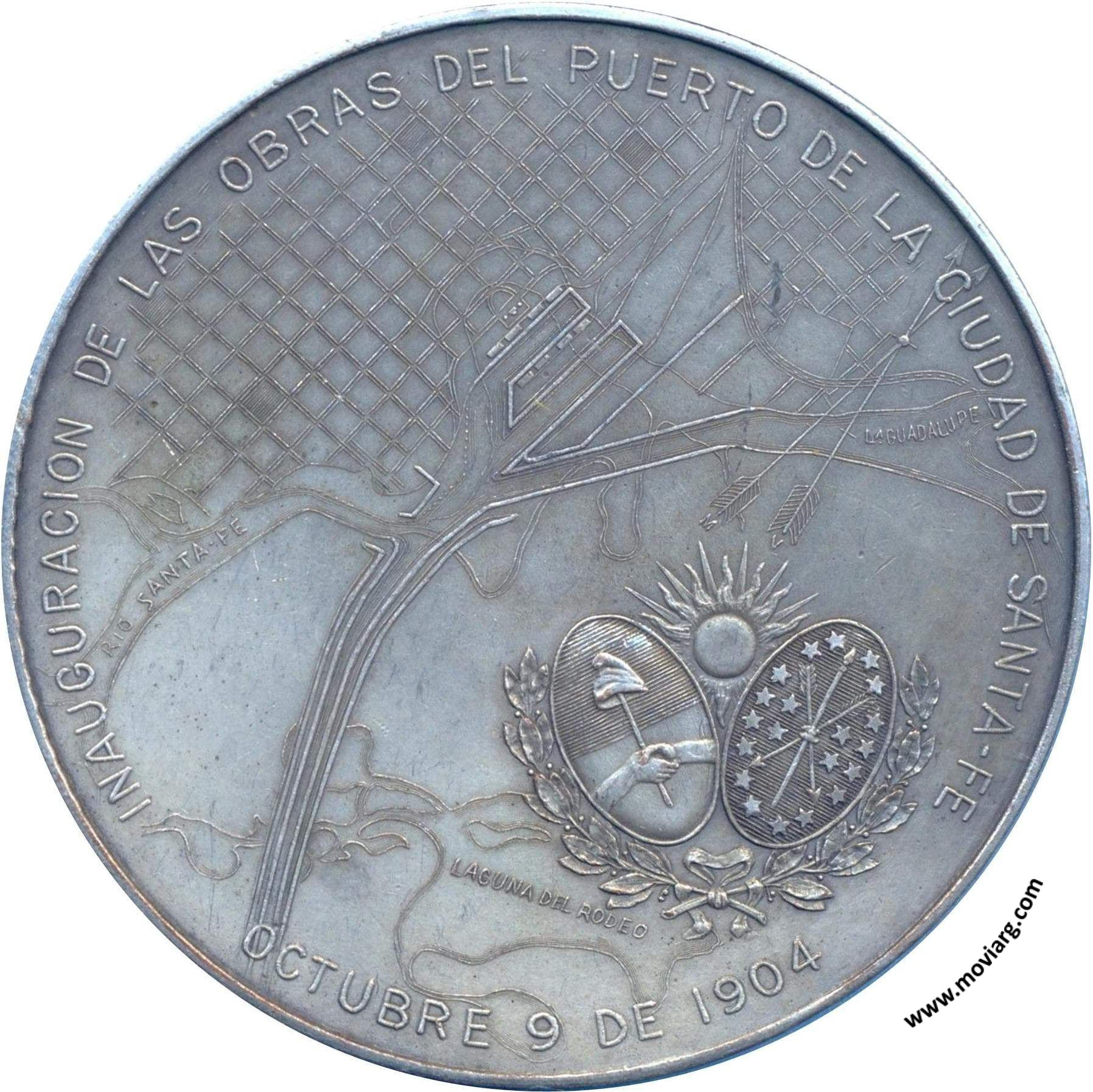 Anverso: DR. RODOLFO FREYRE GOBERNADOR DE SANTA-FE 1902 1906. Firma: J.M.L. / 1902 Reverso: INAUGURACION DE LAS OBRAS DEL PUERTO DE LA CIUDAD DE SANTA-FE / OCTUBRE 9 DE 1904. Campo: RIO SANTA-FE / LAGUNA DEL RODEO / LA. GUADALUPE Referencia: | |