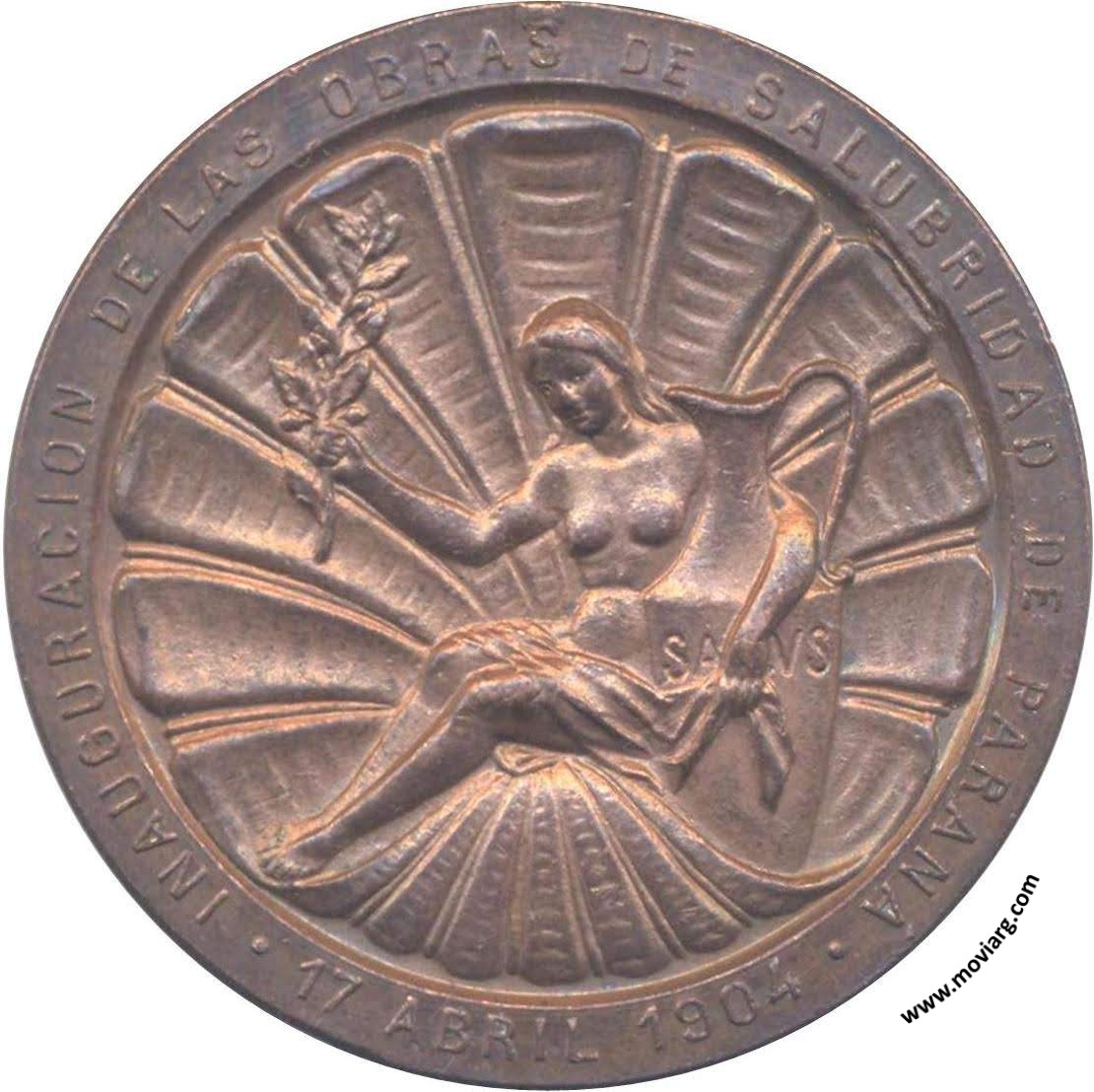 Anverso: INAUGURACION DE LAS OBRAS DE SALUBRIDAD DE PARANA / 17 ABRIL 1904 Reverso: REPUBLICA ARGENTINA / PRESIDENTE / JULIO A. ROCA / MINISTRO / EMILIO CIVIL / MINISTERIO DE OBRAS PÚBLICAS. Firma: J. GOTTUZZO Referencia: | |
