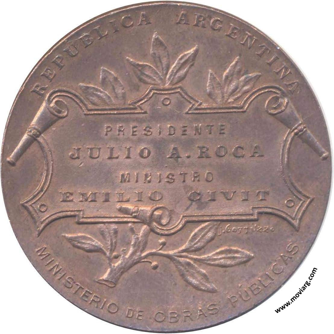 | Año: 1904 Obras y Servicios Públicos Metal: Cobre - Peso: 29gr - Módulo: 40mm Grabador: Juan Gottuzzo | |