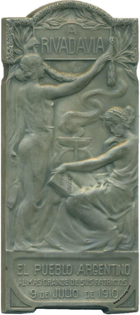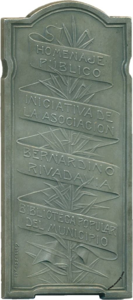 Anverso: A / RIVADAVIA / EL PUEBLO ARGENTINO / AL MAS GRANDE DE SUS PATRICIOS / 9 DE JULIO DE 1910. Campo: VIVID / UNIDAS Reverso: HOMENAJE / PÚBLICO / INICIATIVA DE / LA ASOCIACION / BERNARDINO / RIVADAVIA / BIBLIOTECA POPULAR / DEL MUNICIPIO. Firma: GOTTUZZO Y CA. Referencia: | |