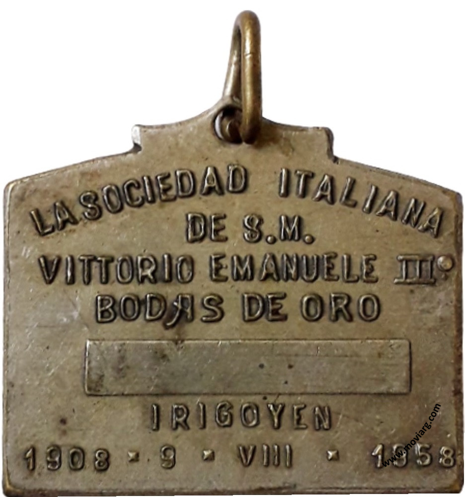 Colección MDS Anverso: REPUBLICA / ARGENTINA / REPUBLICA / ITALIANAReverso: LA SOCIEDAD ITALIANA / DE S. M. / VITTORIO EMANUELE III / BODAS DE ORO / IRIGOYEN / 1908 · 9 · VIII · 1958 Referencia: | |