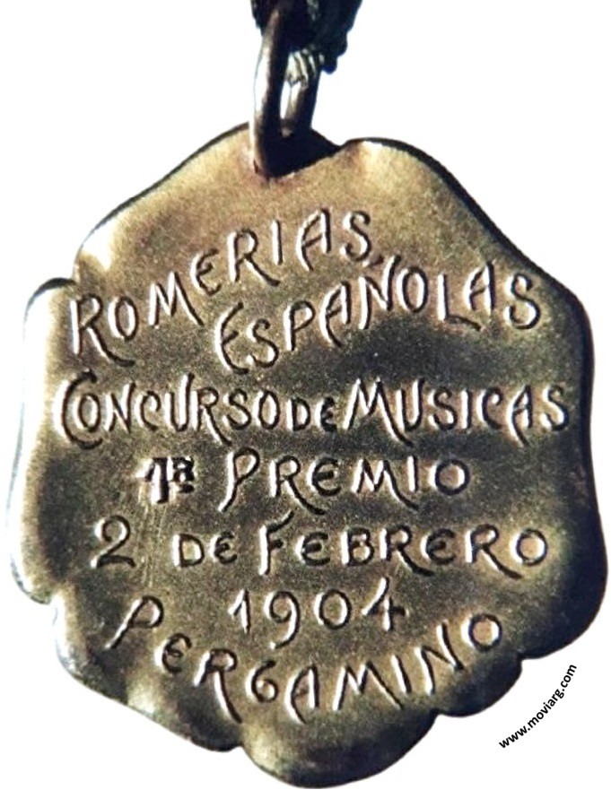 Anverso: Firma: J. GOTTUZZO Reverso: ROMERIAS / ESPAÑOLAS / CONCURSO DE MUSICAS / [ 1R. ] PREMIO / 2 DE FEBRERO / 1904 / PERGAMINO Referencia: | |