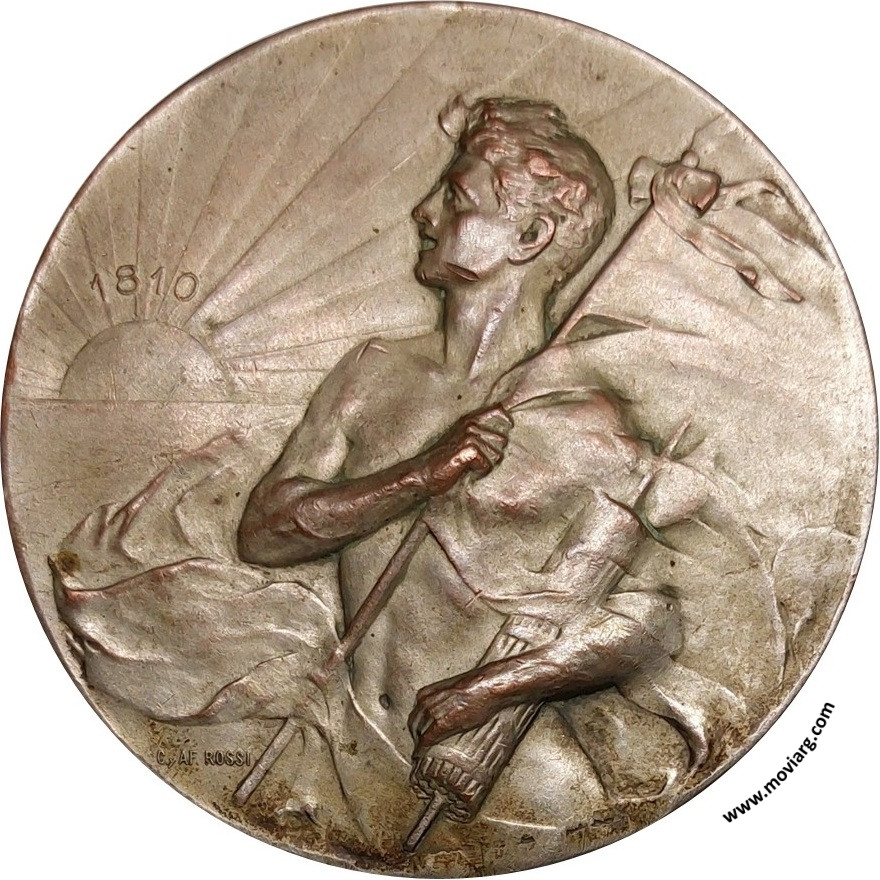 Anverso: 1810. Firma: C. Y AF. ROSSI Reverso: BUENOS AIRES - 8 MAYO 1910. / CON EL PROPOSITO DE CONCURRIR EL / P.E. DE LA NACIÓN Á LOS FESTEJOS DEL / 1R. CENTENARIO DE LA REVOLUCION DE MAYO DE 1810 / Y EN EL DESEO DE CONMEMORAR LA GLORIOSA FECHA / EL PRESIDENTE DE LA REPÚBLICA DECRETA: / ART. 1° POR LA CASA DE MONEDA SE ACUÑARÁN MEDALLAS / CONMEMORATIVAS DEL 1R. CENTENARIO DE LA EMANCIPACIÓN / NACIONAL CUYAS COMPOSICIONES Y GRABADOS DEBERÁN / CONFIRARSE Á ARTISTAS ARGENTINOS / . . . . . . . . . . . . . . . . . . . . . . . . / ART. 4° COMUNIQUESÉ, ECT. / FIGUEROA ALCORTA - MANUEL DE YRIONDO / JOSÉ GALVEZ - V. DE LA PLAZA / ROMULO S. NAÓN - EDUARDO RACEDO / ONOFRE BETBEDER - PEDRO EZCURRA / E. RAMOS MEXIA. Firma: C. Y AF. ROSSI Referencia: | |
