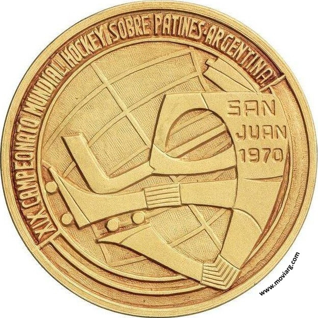 Soler y Llach Anverso: [ XIX CAMPEONATO MUNDIAL HOCKEY SOBRE PATINES - ARGENTINA ] / [ SAN ] / [ JUAN ] / [ 1970 ]Reverso: CAMPEON DEL MUNDO / EN S. JUAN / R. ARGENTINA / 1970. Campo: FEP Referencia: | |