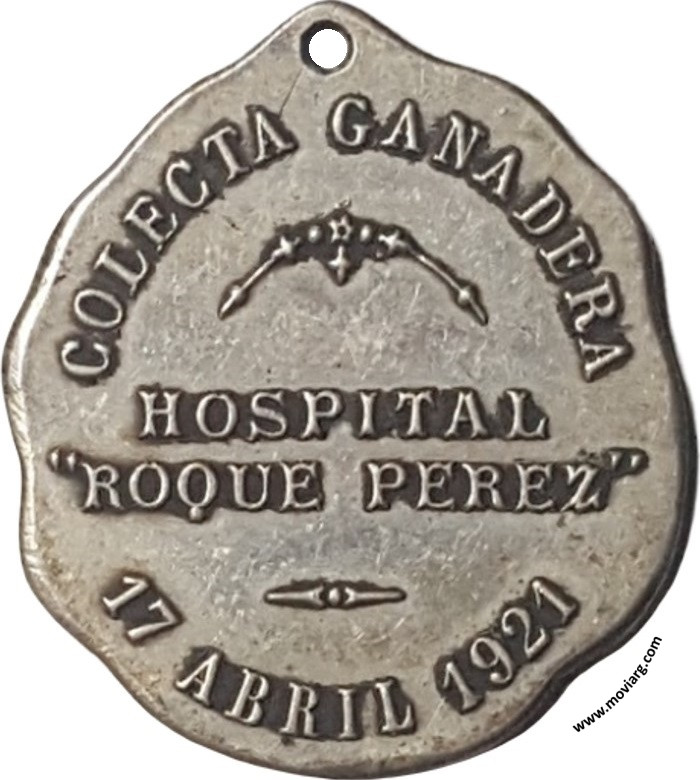 Anverso: CARIDAD Reverso: COLECTA GANADERA / HOSPITAL / " ROQUE PEREZ " / 17 ABRIL 1921 Referencia: | |