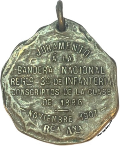 Colección Magnin Anverso: Firma: BELLAGAMBA / Y ROSSIReverso: JURAMENTO / Á LA / BANDERA NACIONAL / RGTO. 3° DE INFANTERIA / CONSCRIPTOS DE LA CLASE / DE 1886 / NOVIEMBRE 1907 / RCA. ANA. Referencia: | |