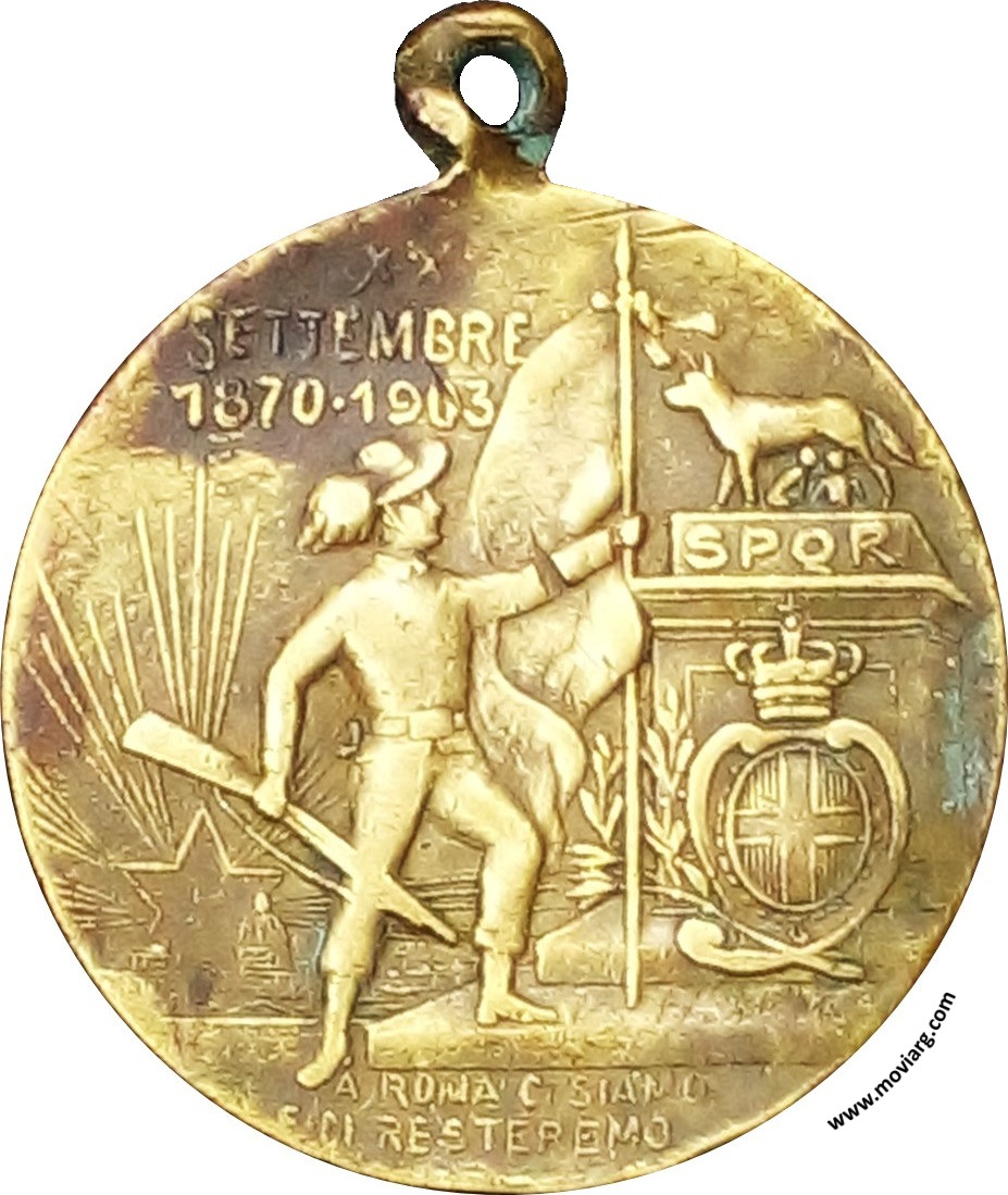 Anverso: XX / SETTEMBRE / 1870 - 1903 / A ROMA CI SIAMO / E CI RESTEREMO. Firma: A. BIDOGLIA. Campo: S.P.Q.R. Reverso: SOCIETÀ UMBERTO 1° / SALTO / ARGENTINO Referencia: | |