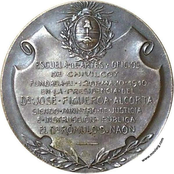 Anverso: Reverso: ESCUELA DE ARTES Y OFICIOS / DE CHIVILCOY / FUNDADA EL 12 DE MAYO 1910 / EN LA PRESIDENCIA DEL / DR. JOSÉ FIGUEROA ALCORTA / SIENDO MINUSTRO DE JUSTICIA / É INSTRUCCIÓN PÚBLICA / EL DR. RÓMULO S. NAÓN. Firma: GOTTUZZO Y CA. Referencia: | |
