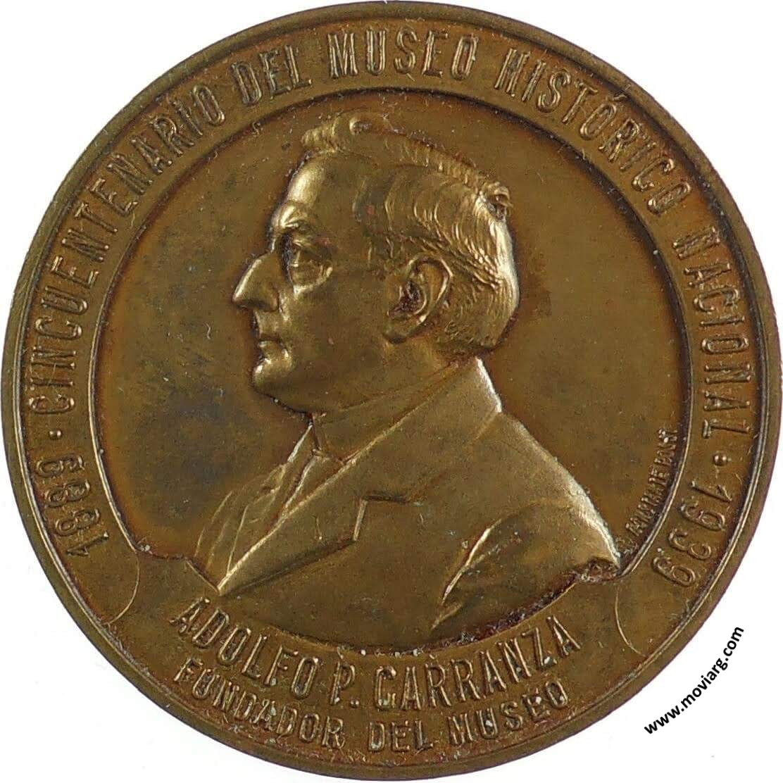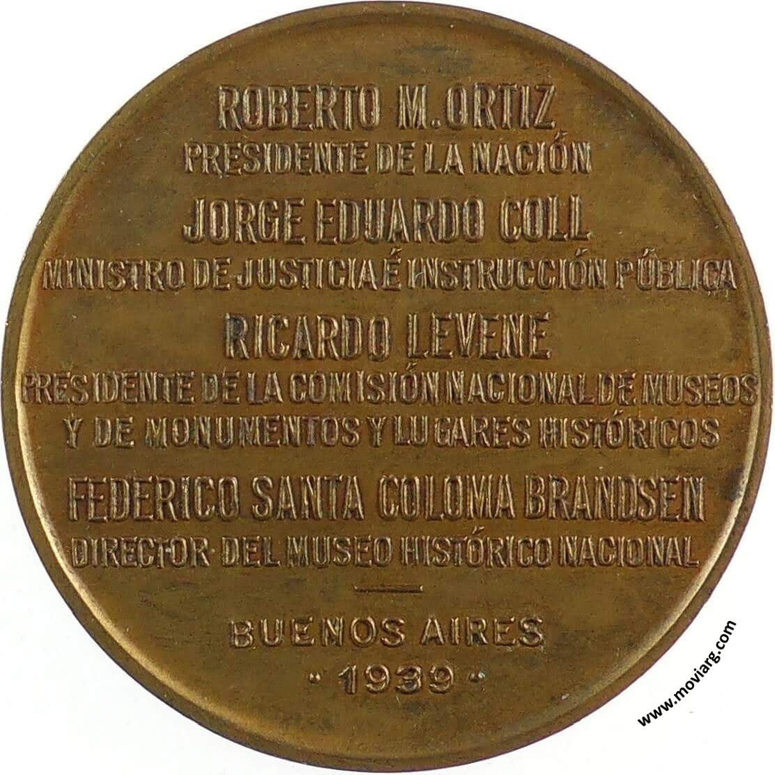 Anverso: 1889 - CINCUENTENARIO DEL MUSEO HISTÓRICO NACIONAL - 1939 / ADOLFO P. CARRANZA / FUNDADOR DEL MUSEO. Firma: CONSTANTE ROSSI Reverso: ROBERTO M. ORTIZ / PRESIDENTE DE LA NACIÓN / JORGE EDUARDO COLL / MINISTRO DE JUSTICIA É INSTRUCCIÓN PÚBLICA / RICARDO LEVENE / PRESIDENTE DE LA COMISIÓN NACIONAL DE MUSEOS / Y DE MONUMENTOS Y LUGARES HISTÓRICOS / FEDERICO SANTA COLOMA BRANDSEN / DIRECTOR DEL MUSEO HISTÓRICO NACIONAL / BUENOS AIRES / 1939 Referencia: | |