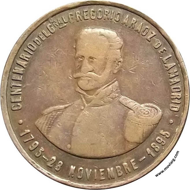 Anverso: CENTENARIO DEL GRAL. GREGORIO ARAOZ DE LAMADRID / 1795 - 28 NOVIEMBRE - 1895 Reverso: GUERRERO DE LA INDEPENDENCIA ARGENTINA / HOMENAJE DE LA PROVINCIA DE TUCUMAN Canto: Nota Moviarg: Según (1895) "Memorias del General Gregorio Aráoz de Lamadrid" Buenos Aires, Tomo II, pp542. Hechas por Casa Gottuzzo y Cia. con 7 medallas de Oro, 250 de Plata y 5000 de Cobre Dorado Referencia: | |
