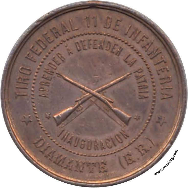 Anverso: TIRO FEDERAL 11 DE INFANTERIA / DIAMANTE ( E. R. ) / APRENDER Á DEFENDER LA PATRIA /INAUGURACION. Firma: BELLAGAMBA Y ROSSI Reverso: FUNDADO Y ORGANIZADO POR EL REGIMIENTO N°11 DE INFANTERIA / 31 DE MARZO 1907 Referencia: | |