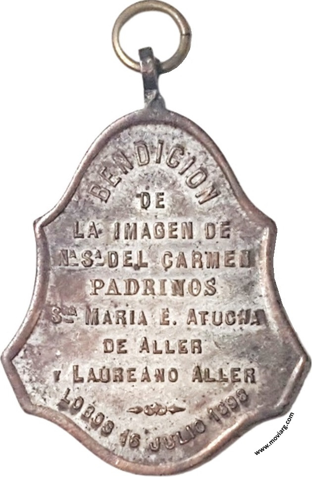Anverso: NUESTRA SEÑORA DEL CARMEN / RUEGA POR NOSOTROS. Firma: ORZALI B. Y C. Reverso: BENDICION / DE / LA IMAGEN DE / NA. SA. DEL CARMEN / PADRINOS / SRA. MARIA E. ATUCHA / DE ALLER / Y LAUREANO ALLER / LOBOS 16 JULIO 1898 Referencia: | |
