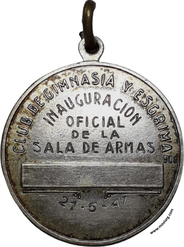 Colección MDS Anverso: CLUB DE GIMNASIA Y ESGRIMA / BUENOS AIRES. Campo: CGE / MENS SANA IN CORPORE SANOReverso: CLUB DE GIMNASIA Y ESGRIMA / [ INAUGURACION ] / [ OFICIAL ] / [ DE LA ] / [ SALA DE ARMAS ] / [ 21-5-47 ]. Exergo: [ 900 ] Referencia: | |