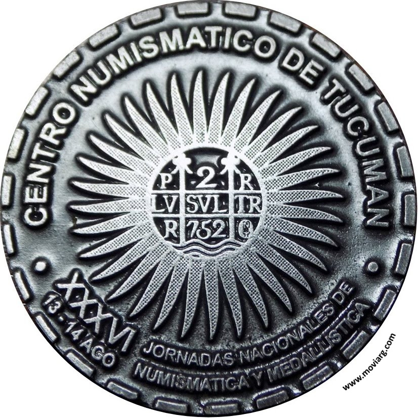 Anverso: REPUBLICA ARGENTINA · BICENTENARIO DE LA INDEPENDENCIA / 1816 · 9 DE JULIO · 2016. Descripción: En el campo, y dentro de una gráfila interna lineal, reproducción parcial de la estatua de la Libertad, obra de la artista tucumana Lola Mora, que consiste en una mujer con vestimentas clásicas y tocada por un gorro de la libertad que sostiene en sus manos restos de una cadena rota, sobre un fondo esmaltado con los colores de la Bandera Nacional. Alrededor, fuera de la gráfila interna, leyenda / REPUBLICA ARGENTINA · BICENTENARIO DE LA INDEPENDENCIA / en arco superior, y / 1813 · 9 DE JULIO · 2016 /, en arco inferior. Reborde de guiones gruesos. Reverso: CENTRO NUMISMATICO DE TUCUMAN / XXXVI / 13 - 14 AGO / JORNADAS NACIONALES DE / NUMISMATICA Y MEDALLISTICA. Descripción: En el centro, isologotipo del Centro Numismático de Tucumán, que consiste en un sol de treinta y dos rayos ondeados horarios en cuyo centro se aprecia el reverso de una peseta tucumana, con el óvalo y las iniciales / TN / visibles. En arco superior, leyenda / CENTRO NUMISMÁTICO DE TUCUMÁN /, y en arco inferior, leyenda en dos partes y dos líneas / XXXVI / 13 - 14 AGO / y / JORNADAS NACIONALES DE / NUMISMATICA Y MEDALLISTICA/ Referencia: | |