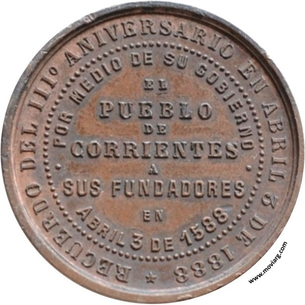 Anverso: EL PUEBLO DE LA PROVCIA. DE CORRIENTES / EN EL GOBNO. DEL DR. R. VIDAL Reverso: RECUERDO DEL III° ANIVERSARIO (sic) EN ABRIL 3 DE 1888 / POR MEDIO DE SU GOBIERNO / EL / PUEBLO / DE / CORRIENTE / A / SUS FUNDADORES / EN / ABRIL 3 DE 1588 Referencia: | |