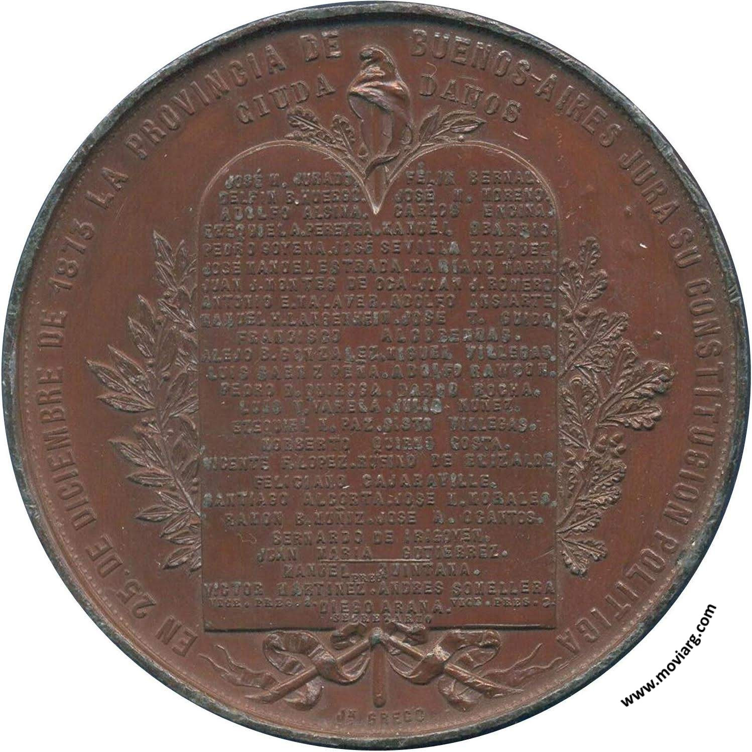 Anverso: Reverso: EN 25. DE DICIEMBRE DE 1873 LA PROVINCIA DE BUENOS-AIRES JURA SU CONSTITUCION POLITICA / CIUDA / NOS / JOSÉ M. JURADO. / FELIZ BERNAL. / DELFIN B. HUERGO. / JOSÉ M. MORENO. / ADOLFO ALSINA. / CARLOS ENCINA. / EZEQUIEL A. PEREYRA. MANUEL OBARRIO. / PEDRO GOYENA. JOSÉ SEVILLA VAZQUEZ. / JOSÉ MANUEL ESTRADA. MARIANO MARIN. / JUAN J. MONTES DE OCA. JUAN J. ROMERO. / ANTONIO E. TALAVER / ADOLFO INSIARTE / MANUEL H. LANGENHEIM. JOSÉ T. GUIDO / FRANCISCO ALCOBENDAS. / ALEJO B. GONZALEZ. MIGUEL VILLEGAS. / LUIS SAENZ PEÑA. ADOLFO RAWSON. / PEDRO D. QUIROGA. DARDO ROCHA. / LUIS V. VARELA. JULIO NUÑEZ. / EZEQUIEL M. PAZ. SISTO VILLEGAS. / NORBERTO QUIRNO COSTA. / VICENTE F. LOPEZ. RUSINO DE ELIZALDE. / FELICIANO CAJARAVILLE. / SANTIAGO ALCORTA. JOSÉ H. MORALES. / RAMON B. MUÑIZ. JOSÉ A. OCANTOS. / BERNARDO DE IRIGOYEN. / JUAN MARIA GUTIERREZ. / MANUEL QUINTANA. / PRES. / VICTOR MARTINEZ. ANDRES SOMELLERA / VICE. PRES. 1. / VICE. PRES. 2. / DIEGO ARANA. / SECRETARIO. Firma: JN. GRECO Canto: Humberto Burzio: "Buenos Aires en la medalla" 1981 p27. Referencia: BURZIO-15 | |