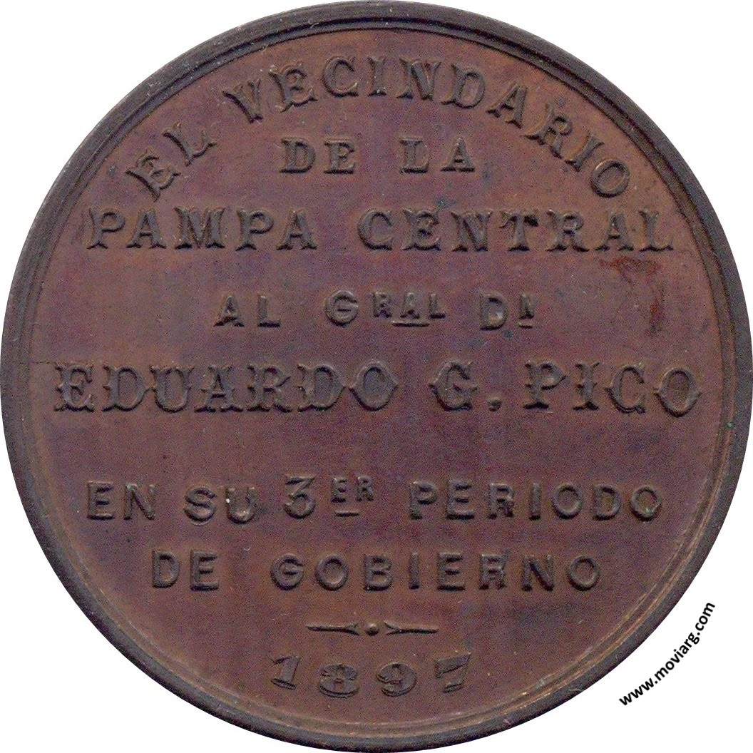 Anverso: Reverso: EL VECINDARIO / DE LA / PAMPA CENTRAL / AL GRAL. DN. / EDUARDO G. PICO / EN SU 3ER. PERIODO / DE GOBIERNO / 1897 Referencia: | |