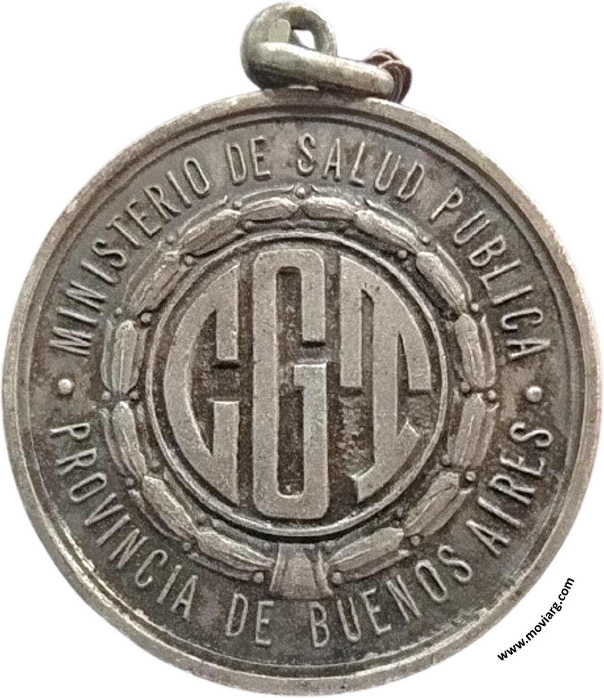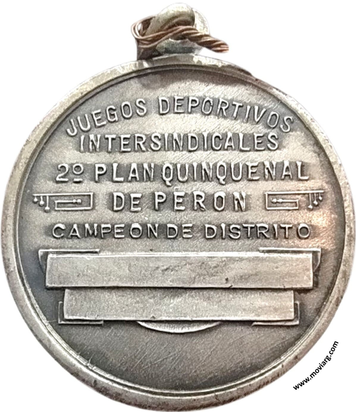 Anverso: MINISTERIO DE SALUD PUBLICA / PROVINCIA DE BUENOS AIRES / C.G.T. (Confederación General del Trabajo) Reverso: JUEGOS DEPORTIVOS / INTERSINDICALES / 2° PLAN QUINQUENAL / DE PERON / CAMPEON DE DISTRITO Referencia: | |