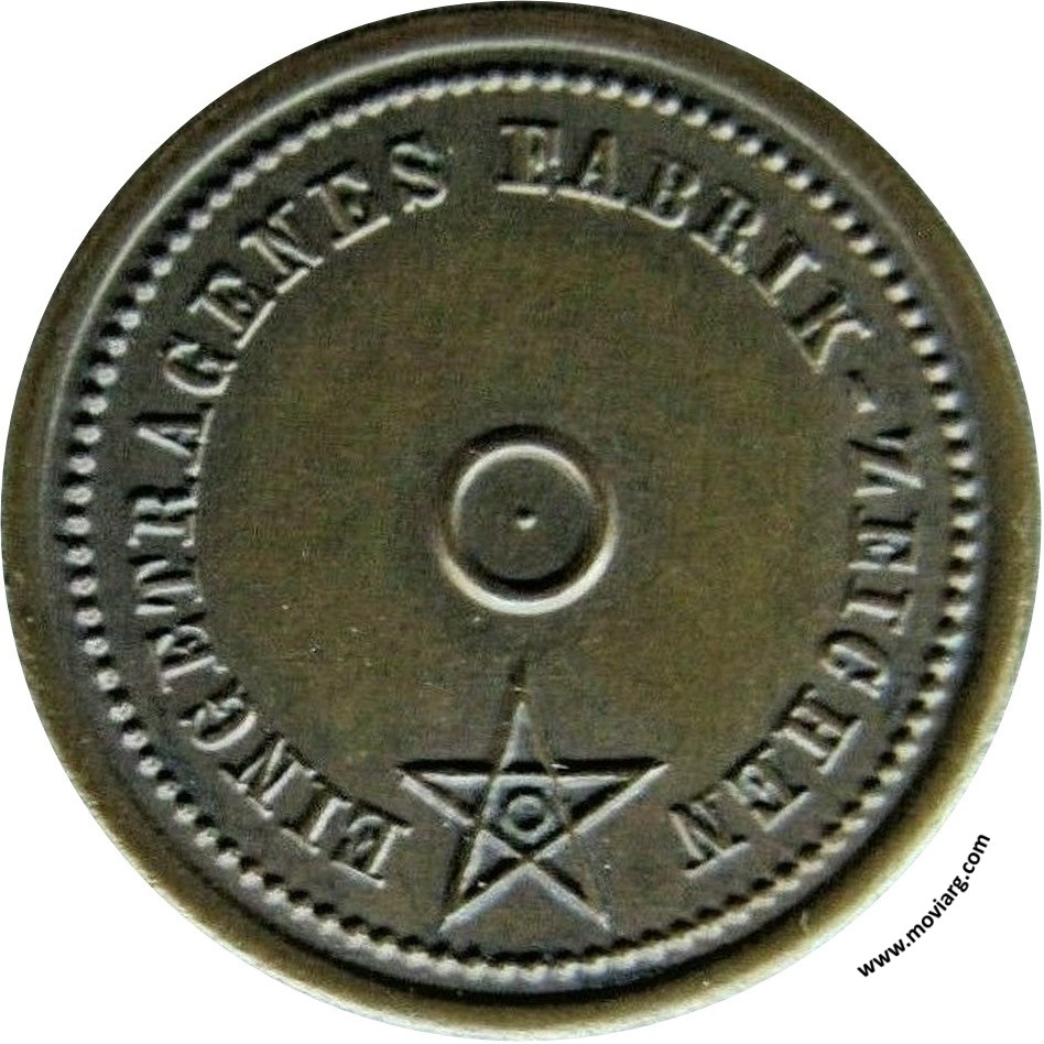 Anverso: REPUBLICA ARGENTINA Reverso: EINGETRAGENES FABRIK-ZEICHEN Canto: Estriado recto. Nota Moviarg: Esta pieza seguramente ha sido acuñada para ser utilizada como botón pero en este caso no se le ha soldado la anilla/pin. Es por ello que figura como Token aunque es muy probable que aparezca otra pieza con la correspondiente soldadura. Referencia: | |