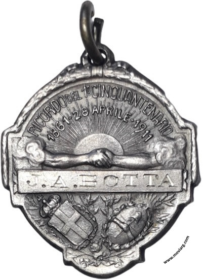 Colección MDS Anverso: SOCIETÁ ITALIANA / UNIONE E BENEVOLENZA / ROSARIOReverso: RICORDO DEL 1° CINQUANTENARIO / 1861 - 28 APRILE - 1911 Referencia: | |