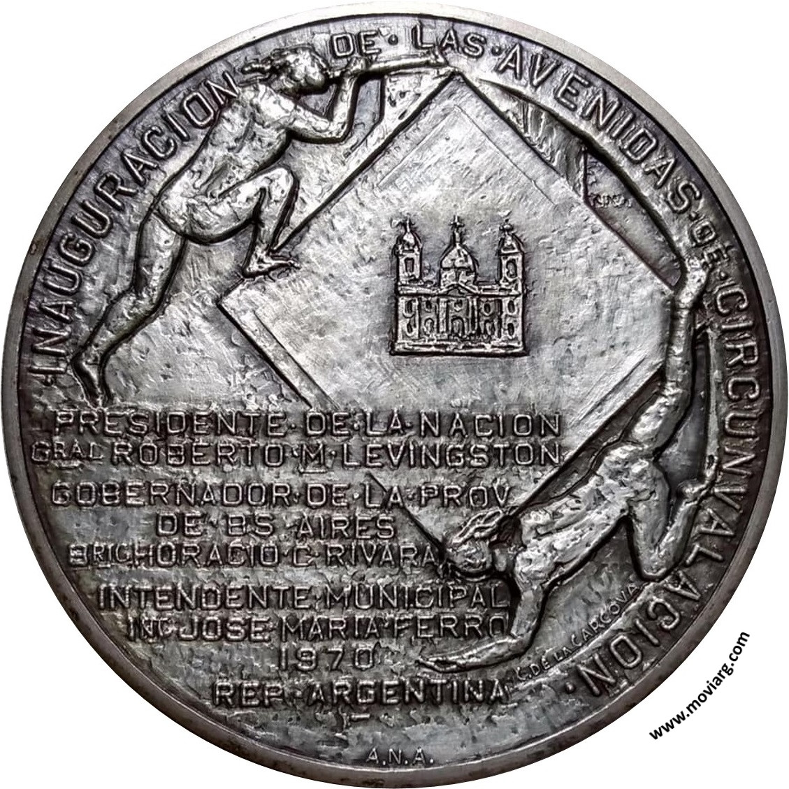 Colección @parryyanumismatico Anverso: EL 22 DE OCTUBRE DE 1854 SE FUNDO LA CIUDAD DE CHIVILCOY. Firma: C. DE LA CARCOVAReverso: INAUGURACION DE LAS AVENIDAD DE CIRCUNVALACION / PRESIDENTE DE LA NACION / GRAL. ROBERTO M. LEVINGSTON / GOBERNADOR DE LA PROV. / DE BS. AIRES / BRIG. HORACIO C. RIVARA / INTENDENTENDE MUNICIPAL / ING. JOSE MARIA FERRO / 1970 / REP. ARGENTINA. Firma: C. DE LA CARCOVA / A.N.A. Referencia: | |