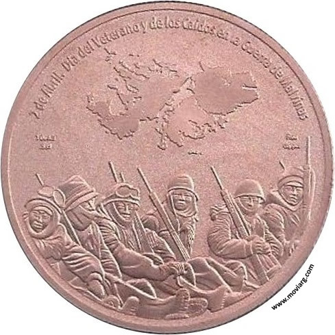 Anverso: 2 DE ABRIL. DIA DEL VETERANO Y DE LOS CAIDOS EN LA GUERRA DE MALVINAS. Campo: 1 OUNCE / .999 / FINE / COPPER Reverso: REPUBLICA ARGENTINA / PERSONAJES DE LA HISTORIA Y LA CULTURA Referencia: | |