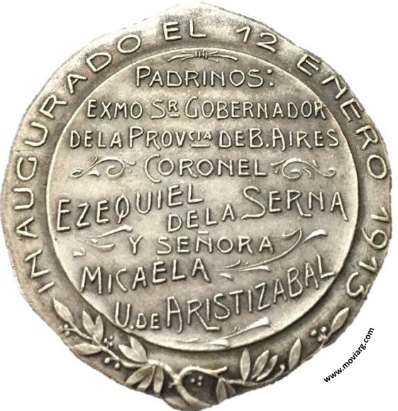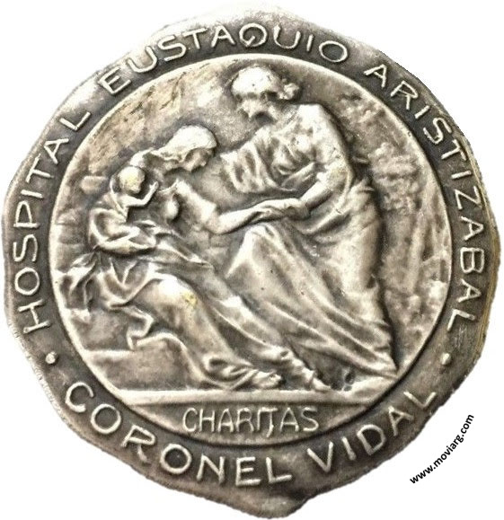 Anverso: HOSPITAL EUSTAQUIO ARISTIZABAL / CORONEL VIDAL / CHARITAS Reverso: INAUGURADO EL 12 ENERO 1913 / PADRINOS: / EXMO. SR. GOBERNADOR / DE LA PROVCIA. DE B. AIRES / CORONEL / EZEQUIEL / DE LA SERNA / Y SEÑORA / MICAELA / U. DE ARISTIZABAL Referencia: | |