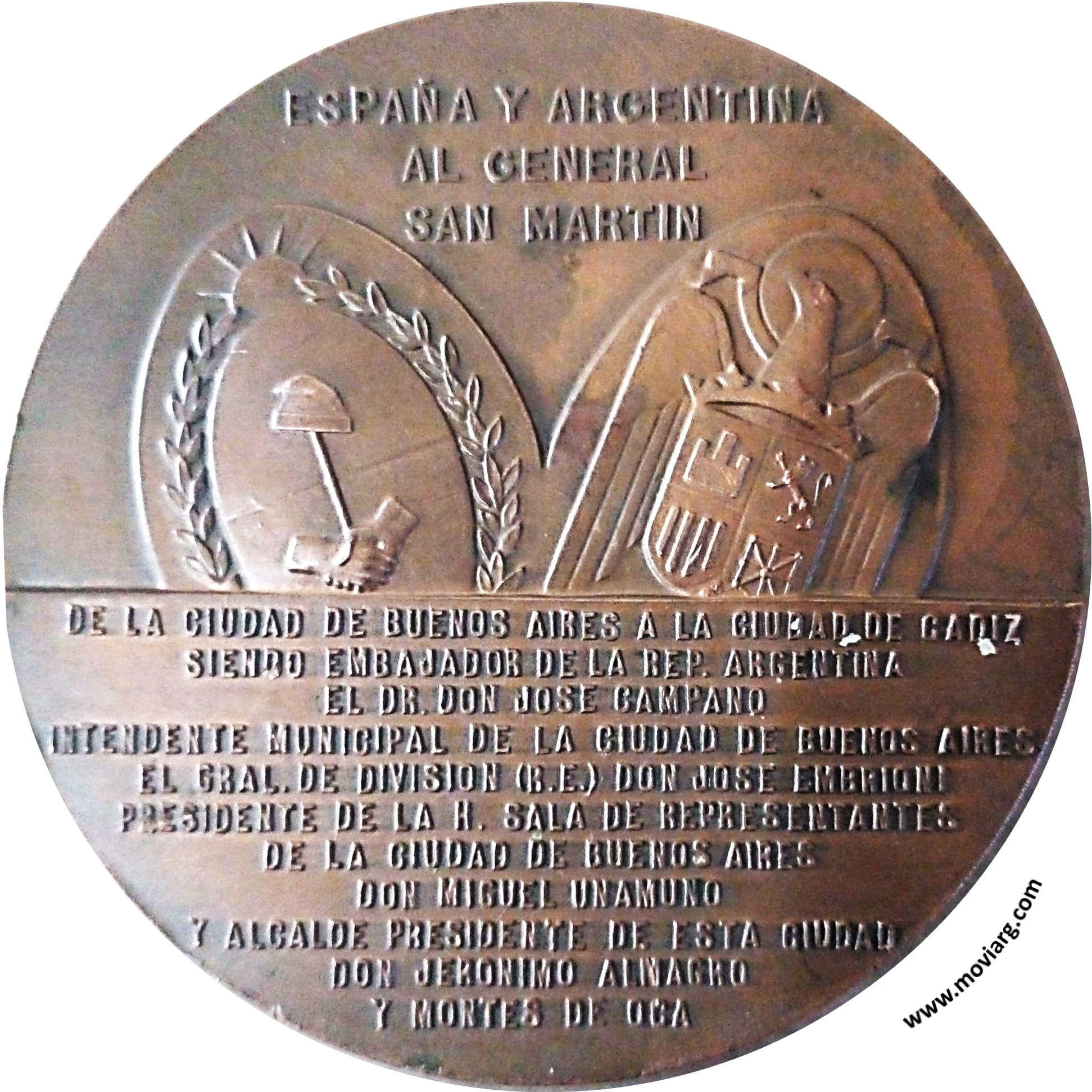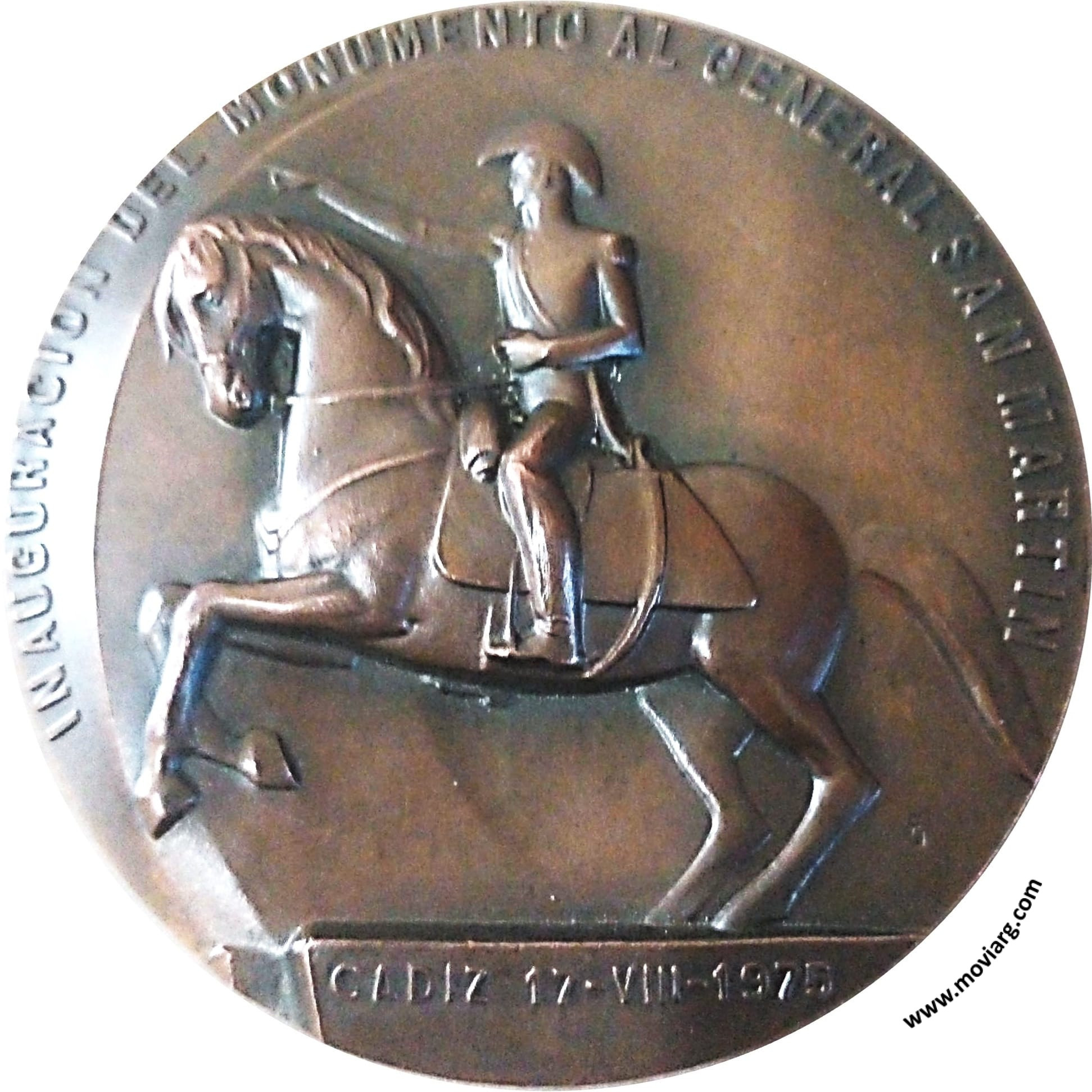 Anverso: INAUGURACION DEL MONUMENTO AL GENERAL SAN MARTIN / CADIZ 17 - VIII - 1975 Reverso: ESPAÑA Y ARGENTINA / AL GENERAL / SAN MARTIN / DE LA CIUDAD DE BUENOS AIRES A LA CIUDAD DE CADIZ / SIENDO EMBAJADOR DE LA REP. ARGENTINA / EL DR. DON JOSE CAMPANO / INTENDENTE MUNICIPAL DE LA CIUDAD DE BUENOS AIRES / EL GRAL. DE DIVISION (R.E.) DON JOSE EMBRIONO / PRESIDENTE DE LA H. SALA DE REPRESENTANTES / DE LA CIUDAD DE BUENOS AIRES / DON MIGUEL UNAMUNO / Y ALCALDE PRESINDENTE DE ESTA CIUDAD / DON JERONIMO ALMAGRO / Y MONTES DE OCA Referencia: | |