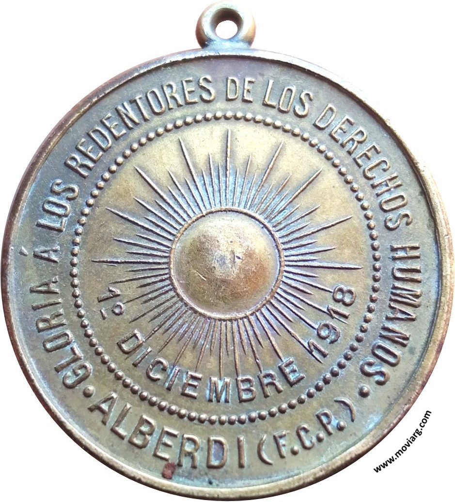 Anverso: Firma: Q. PIANA Reverso: GLORIA Á LOS REDENTORES DE LOS DERECHOS HUMANOS / ALBERDI ( F.C.P. ) / 1° DICIEMBRE 1918 Referencia: | |