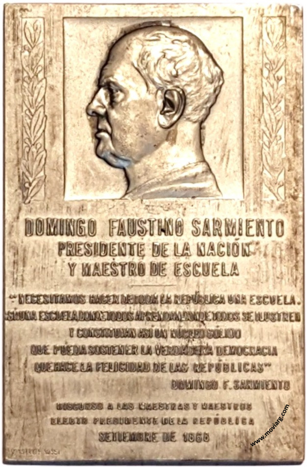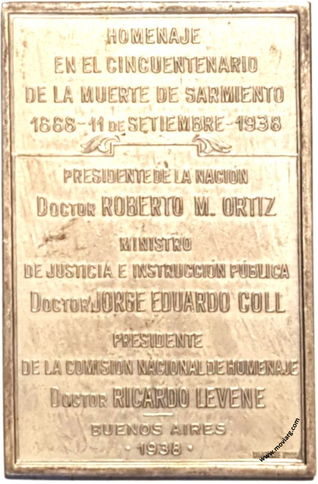 Anverso: DOMINGO FAUSTINO SARMIENTO / PRESIDENTE DE LA NACIÓN / Y MAESTRO DE ESCUELA / " NECESITAMOS HACER DE TODA LA REPÚBLICA UNA ESCUELA. / SÍ. UNA ESCUELA DONDE TODOS APRENDAN DONDE TODOS SE ILUSTREN / Y CONSTITUYAN ASÍ UN NÚCLEO SÓLIDO /QUE PUEDA SOSTENER LA VERDADERA DEMOCRACIA / QUE HACE LA FELICIDAD DE LAS REPÚBLICAS " / DOMINGO F. SARMIENTO / DISCURSO A LAS MAESTRAS Y MAESTROS / ELECTO PRESIDENTE DE LA REPÚBLICA / SETIEMBRE DE 1868. Firma: CONSTANTE ROSSI Reverso: HOMENAJE / EN EL CINCUENTENARIO / DE LA MUERTE DE SARMIENTO / 1888 - 11 DE SETIEMBRE - 1938 / PRESIDENTE DE LA NACIÓN / DOCTOR ROBERTO M. ORTIZ / MINISTRO / DE JUSTICIA E INSTRUCCIÓN PÚBLICA / DOCTOR JORGE EDUARDO COLL / PRESIDENTE / DE LA COMISIÓN NACIONAL DE HOMENAJE / DOCTOR RICARDO LEVENTE / BUENOS AIRES / 1938. Firma: CONSTANTE ROSSI Canto: Liso Referencia: | |