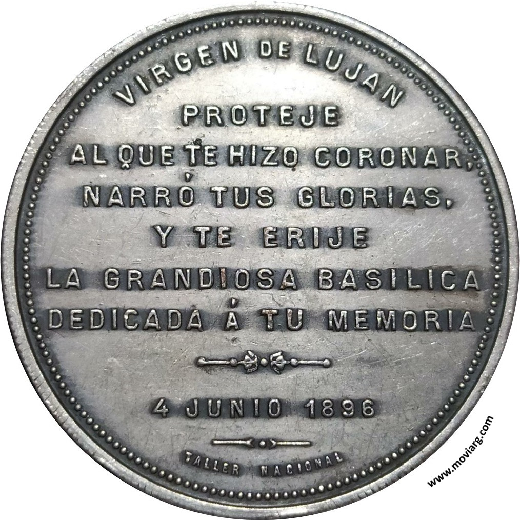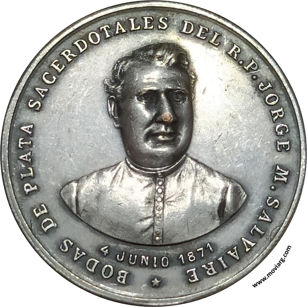 Anverso: BODAS DE PLATA SACERDOTALES DEL R.P. JORGE M. SALVAIRE / 4 JUNIO 1871 Reverso: VIRGEN DE LUJAN / PROTEJE / AL QUE TE HIZO CORONAR, / NARRÓ TUS GLORIAS, / Y TE ERIJE / LA GRANDIOSA BASILICA / DEDICADA Á TU MEMORIA / 4 JUNIO 1896. Firma: TALLER NACIONAL Referencia: | |