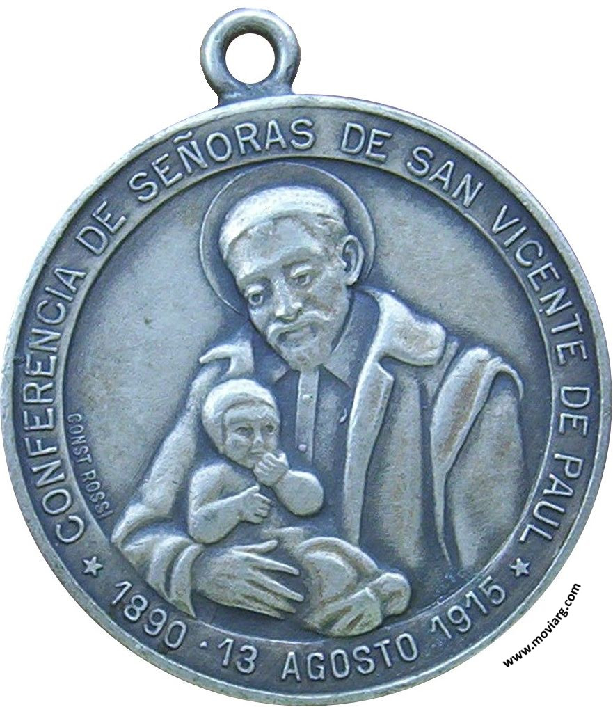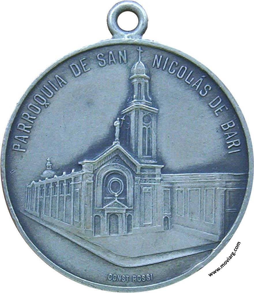 Anverso: PARROQUIA DE SAN NICOLÁS DE BARI. Firma: CONST. ROSSI Reverso: CONFERENCIA DE SEÑORAS DE SAN VICENTE DE PAUL / 1890 · 13 AGOSTO 1915. Firma: CONST. ROSSI Canto: Humberto Burzio: "Buenos Aires en la medalla" 1981 p1021. Referencia: BURZIO-3235 | |