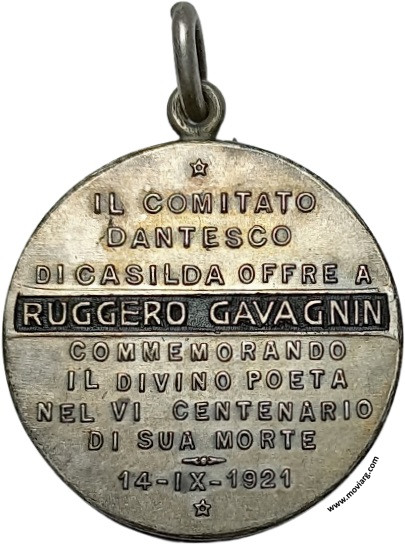 Colección MDS Anverso: MOSTRO CIO CHE POTEA LA LINGUA NOSTRAReverso: IL COMITATO / DANTESCO / DI CASILDA OFFRE A / [ RUGGERO GAVAGNIN ] / COMMEMORANDO / IL DIVINO POETA / NEL VI CENTENARIO / DI SUA MORTE / 14-IX-1921 Canto: Liso. PLATA Referencia: | |