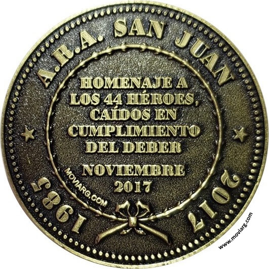 Anverso: P. FERNÁNDEZ / J. BERGALLO / F. VILLARREAL / F. MENDOZA / D. WAGNER / E. KRAWCZYK / V. MAROLI / A. ZUNDA MEOQUI / R. MARTÍN SILVA / J. MEALLA / A. TAGLIAPIETRA / J. GALLARDO / A. SÁNCHEZ / W. REAL / H. RODRÍGUEZ / V. CORONEL / C. VARGAS / R. MEDINA / C. VALLEJOS / H. HERRERA / V. ENRÍQUEZ / R. ALFARO ROD. / D. FERNÁNDEZ / L. LEIVA / J. MONZÓN / J. VALDEZ / C. IBÁÑEZ / M. A. TOCONAS / F. ESPINOZA / J. ORTIZ / H. ARAMAYO / L. E. GARCÍA / S. CUELLAR / F. SANTILLI / A. ARJONA / E. CASTILLO / L. NOLASCO / D. MELIÁN / G. SUÁREZ / D. POLO / L. CISNEROS / L. NIZ / F. ALCARAZ CORIA / A. TOLABA. Campo: A.R.A. SAN JUAN (S-42) Reverso: 1985 / A.R.A. SAN JUAN / 2017 / HOMENAJE A / LOS 44 HÉROES, / CAÍDOS EN / CUMPLIMIENTO / DEL DEBER / NOVIEMBRE / 2017. Firma: MOVIARG.COM Canto: Liso Referencia: | |