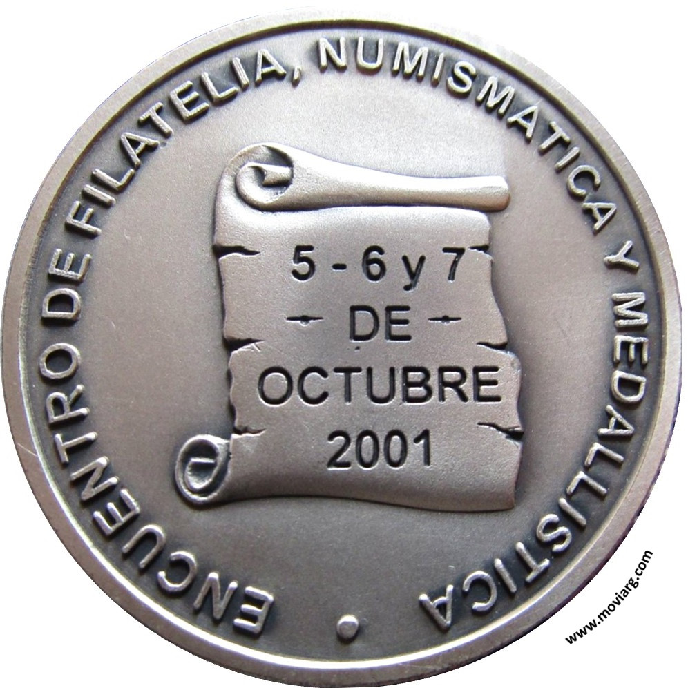 Anverso: CENTRO FILATELICO Y NUMISMATICO / " CARLOS / MARIO / PINTO " / OLAVARRIA. Firma: RUIZ Reverso: ENCUENTRO DE FILATELIA, NUMISMATICA Y MEDALLISTICA / 5 - 6 Y 7 / DE / OCTUBRE / 2001 Referencia: | |
