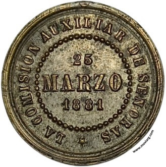 Anverso: INAUGURACION / DEL / TEMPLO / DE LAS / CONCHAS Reverso: LA COMISION AUXILIAR DE SEÑORAS / 25 / MARZO / 1881 Referencia: | |