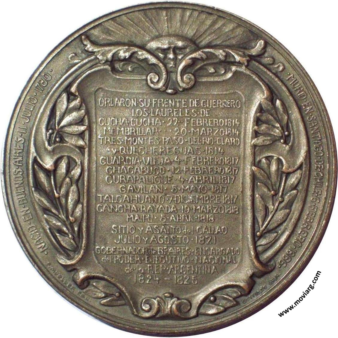 Anverso: JUAN GREGORIO DE LAS HERAS / REIMPATRIACION DE SUS RESTOS 20 OCTUBRE 1906 Reverso: NACIO EN BUENOS AIRES 11 JULIO 1780 / MURIO EN SANTIAGO DE CHILE 6 FEBRERO 1866 / ORLARON SU FRENTE DE GUERRERO / LOS LAURELES DE / CUCHA CUCHA 22 FEBRERO 1814 / MEMBRILLAR 20 MARZO 1814 / TRES MONTES PASO DEL RIO CLARO / Y QUECHEREGUAS 1814 / GUARDIA VIEJA 4 FEBRERO 1817 / CHACABUCO 12 FEBRERO 1817 / CURAPALIGUE 4 ABRIL 1814 / GAVILAN 5 MAYO 1817 / TALCAHUANO 7 DICIEMBRE 1917 / CANCHA RAYADA 19 MARZO 1818 / MAIPU 5 ABRIL 1818 / SITIO Y ASALTO DEL CALLAO / JULIO Y AGOSTO 1821 / GOBERNADOR DE BS. AIRES Y ENCARGADO / DEL PODER EJECUTIVO NACIONAL / DE LA REP. ARGENTINA / 1824 - 1825. Firma: E MUELLER ESC. / GOTTUZZO GRA. Referencia: | |