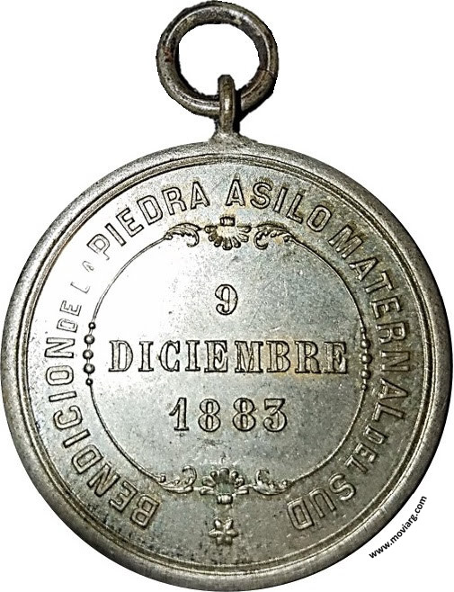 Anverso: SOCIEDAD / DAMAS / DE / CARIDAD Reverso: BENDICION DE LA PIEDRA ASILO MATERNAL DEL SUD / 9 / DICIEMBRE / 1883 Canto: Humberto Burzio: "Buenos Aires en la medalla" 1981 p1010. Referencia: BURZIO-3177 | |
