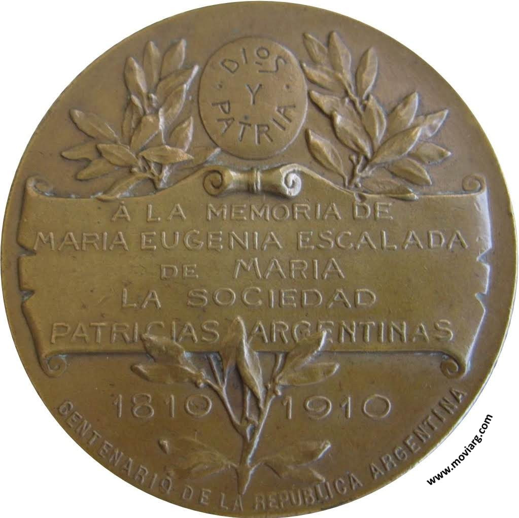 Anverso: 1781 / 1822 Reverso: DIOS / Y / PATRIA / Á LA MEMORIA DE / MARIA EUGENIA ESCALADA / DE MARIA / LA SOCIEDAD / PATRICIAS ARGENTINAS / 1810 1910 / CENTENARIO DE LA REPÚBLICA ARGENTINA Referencia: | |
