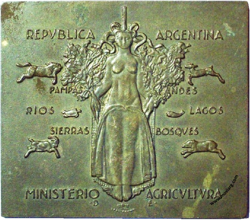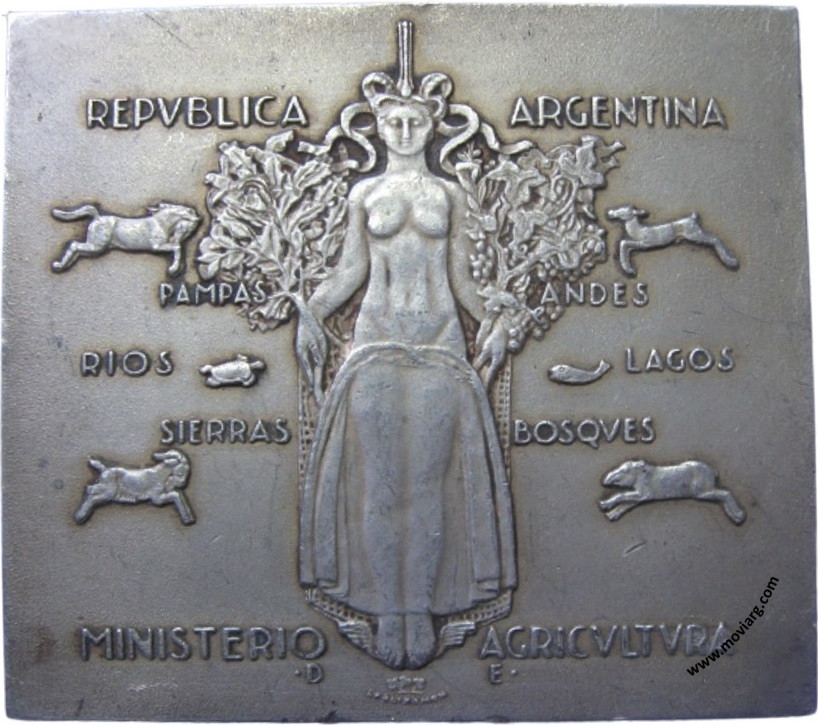 Anverso: REPUBLICA / ARGENTINA / PAMPAS / ANDES / RIOS / LAGOS / SIERRAS / BOSQUES / MINISTERIO / D / E / AGRICULTURA / Y GANADERIA / DE LA NACION. Firma: LEGUIZAMON Reverso: PREMIO MINISTERIO / DE AGRICULTURA / Y GANADERIA / DE LA NACION. Firma: GOTTUZZO Y PIANA Referencia: | |