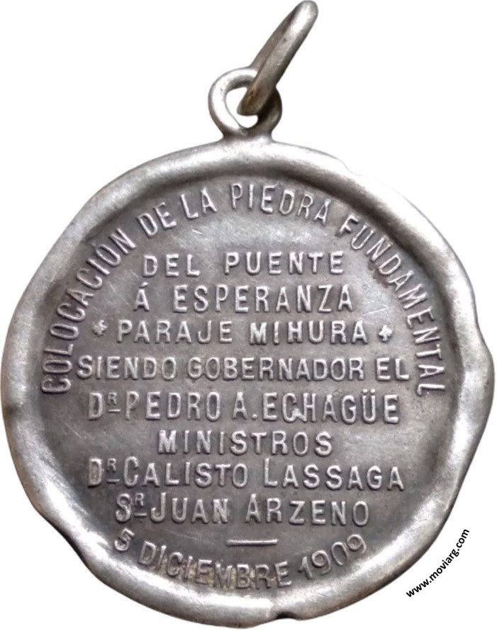 Anverso: Firma: C. Y AF. ROSSI Reverso: COLOCACIÓN DE LA PIEDRA FUNDAMENTAL / DEL PUENTE / Á ESPERANZA / PARAJE MIHURA / SIENDO GOBERNADOR EL / DR. PEDRO A. ECHAGÜE / MINISTROS / DR. CALISTO LASSAGA / SR. JUAN ARZENO / 5 DICIEMBRE 1909 Canto: Liso. PLATA Referencia: | |