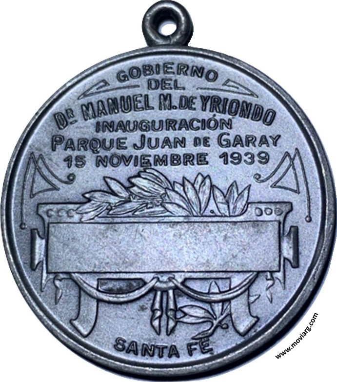 Colección Magnin Anverso: Firma: CONSTANTE ROSSIReverso: GOBIERNO / DEL / DR. MANUEL M. DE YRIONDO / INAUGURACIÓN / PARQUE JUAN DE GARAY / 15 NOVIEMBRE 1939 / SANTA FE Referencia: | |