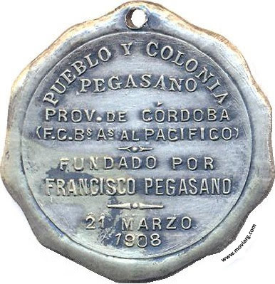 Anverso: Firma: J. GOTTUZZO Reverso: PUEBLO Y COLONIA / PEGASANO / PROV. DE CÓRDOBA / (F.C. BS. AS. AL PACIFICO) / FUNDADO POR / FRANCISCO PEGASANO / 21 MARZO / 1908 Referencia: | |