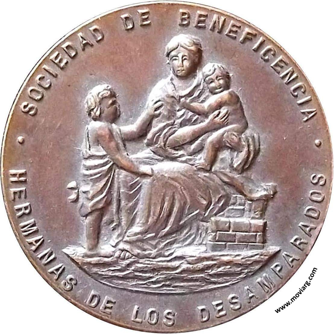 Anverso: SOCIEDAD DE BENEFICENCIA / HERMANAS DE LOS DESAMPARADOS Reverso: INAUGURACION Y BENDICION / DE LA / SECRETARIA / 29 ABRIL 1900 / PADRINOS : / JUAN A. BUSCHIAZZO / CANDELARIA RUFINO / DE / SAENZ VALIENTE Canto: Humberto Burzio: "Buenos Aires en la medalla" 1981 p1016. Referencia: BURZIO-3208 | |