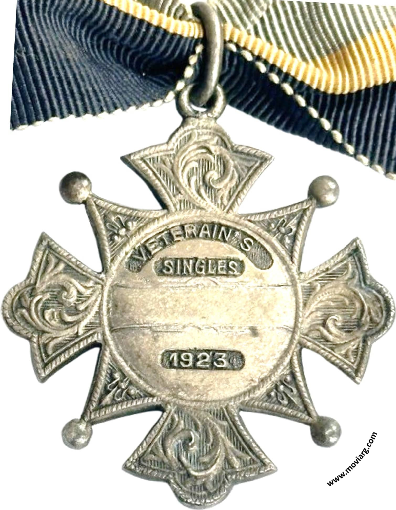 Anverso: BUENOS AIRES LAWN TENNIS CLUB / CHAMPIONSHIP / OF / THE / RIVER PLATE Reverso: [ VETERAIN'S (sic) ] / [ SINGLES ] / [ 1923 ] Referencia: | |