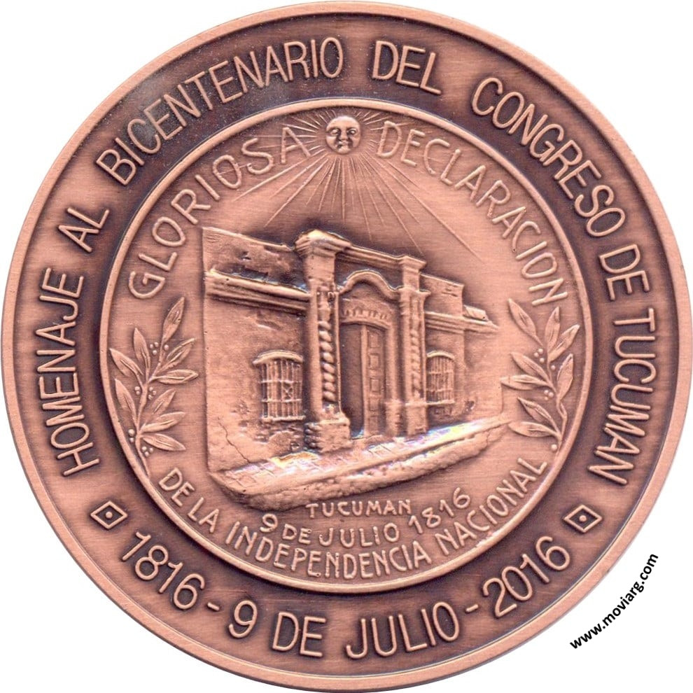 Anverso: HOMENAJE AL BICENTENARIO DEL CONGRESO DE TUCUMAN / 1816 - 9 DE JULIO - 2016. Campo: GLORIOSA DECLARACION / DE LA INDEPENDENCIA NACIONAL / TUCUMAN / 9 DE JULIO 1816. Descripción: Texto perimetral, en el arco superior / HOMENAJE AL BICENTENARIO DEL CONGRESO DE TUCUMAN / y en el arco inferior / 1816 – 9 DE JULIO – 2016 / separados por 2 rombos con perla interior. Al centro y rodeado de círculo imagen en perspectiva derecha de la Casa Histórica de Tucumán flanqueada por dos ramos de laurel frutado y timbrada por un sol radiante, al pie la leyenda en dos líneas / TUCUMAN / 9 DE JULIO 1816 /, en el arco superior la leyenda / GLORIOSA DECLARACION / y en el arco inferior / DE LA INDEPENDENCIA NACIONAL /. Reverso: ACADEMIA ARGENTINA DE NUMISMATICA Y MEDALLISTICA / BUENOS AIRES. Campo: ARDESCIT ET VIRESCIT. Descripción: Ocupando todo el campo el isologotipo de la Institución - Academia Argentina de numismática y medallística. Referencia: | |