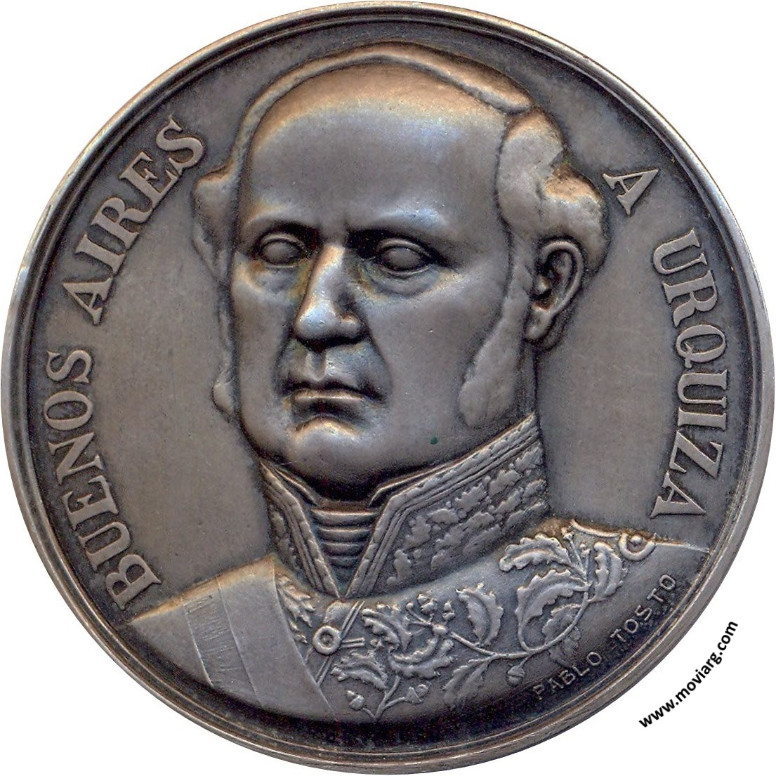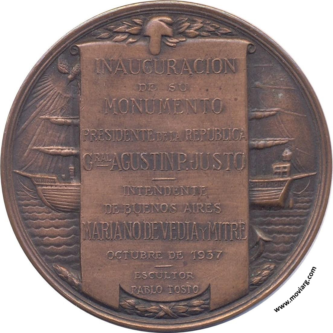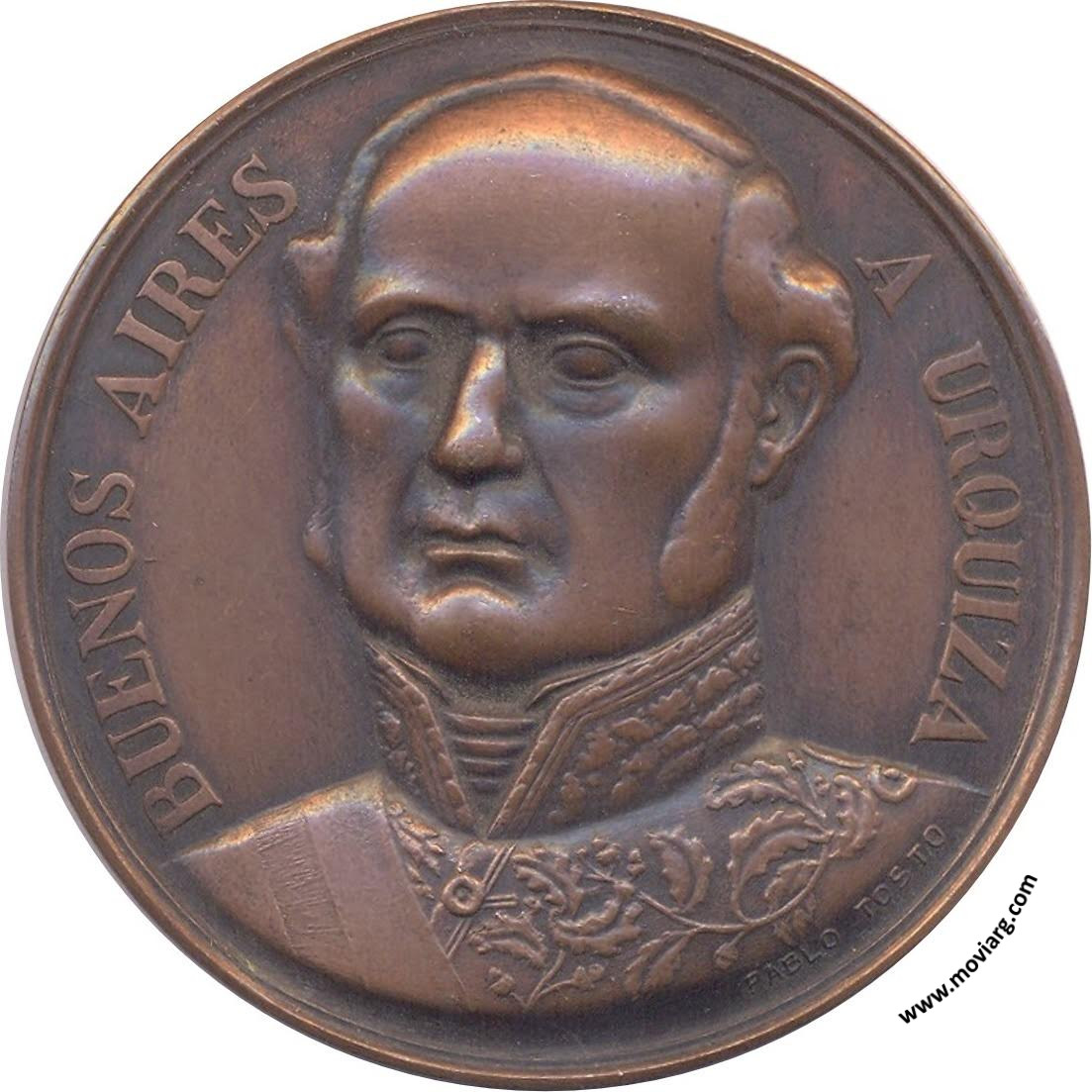 Anverso: BUENOS AIRES / A URQUIZA. Firma: PABLO TOSTO Reverso: INAUGURACION / DE SU / MONUMENTO / PRESIDENTE DE LA REPUBLICA / GRAL. AGUSTIN P. JUSTO / INTENDENTE / DE BUENOS AIRES / MARIANO DE VEDIA Y MITRE / OCTUBRE DE 1937 / ESCULTOR / PABLO TOSTO Referencia: | |