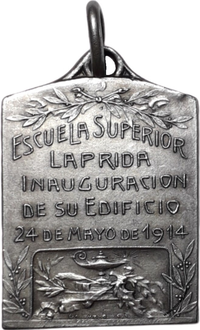 Colección MDS Anverso: ESCUELA SUPERIOR / LAPRIDA / INAUGURACION / DE SU EDIFICIO / 24 DE MAYO DE 1914. Firma: GOTTUZZO Y CA.Reverso: GOBERNADOR DE LA PROVINCIA / DR. PRÓCORO CRESPO / MINISTRO DE I. PÚBLICA / SR. DAMIAN P. GARAT / DIRECCION GRAL. DE ESCUELAS / PROF. MANUEL P. ANTEQUEDA Canto: Liso. PLATA Referencia: | |