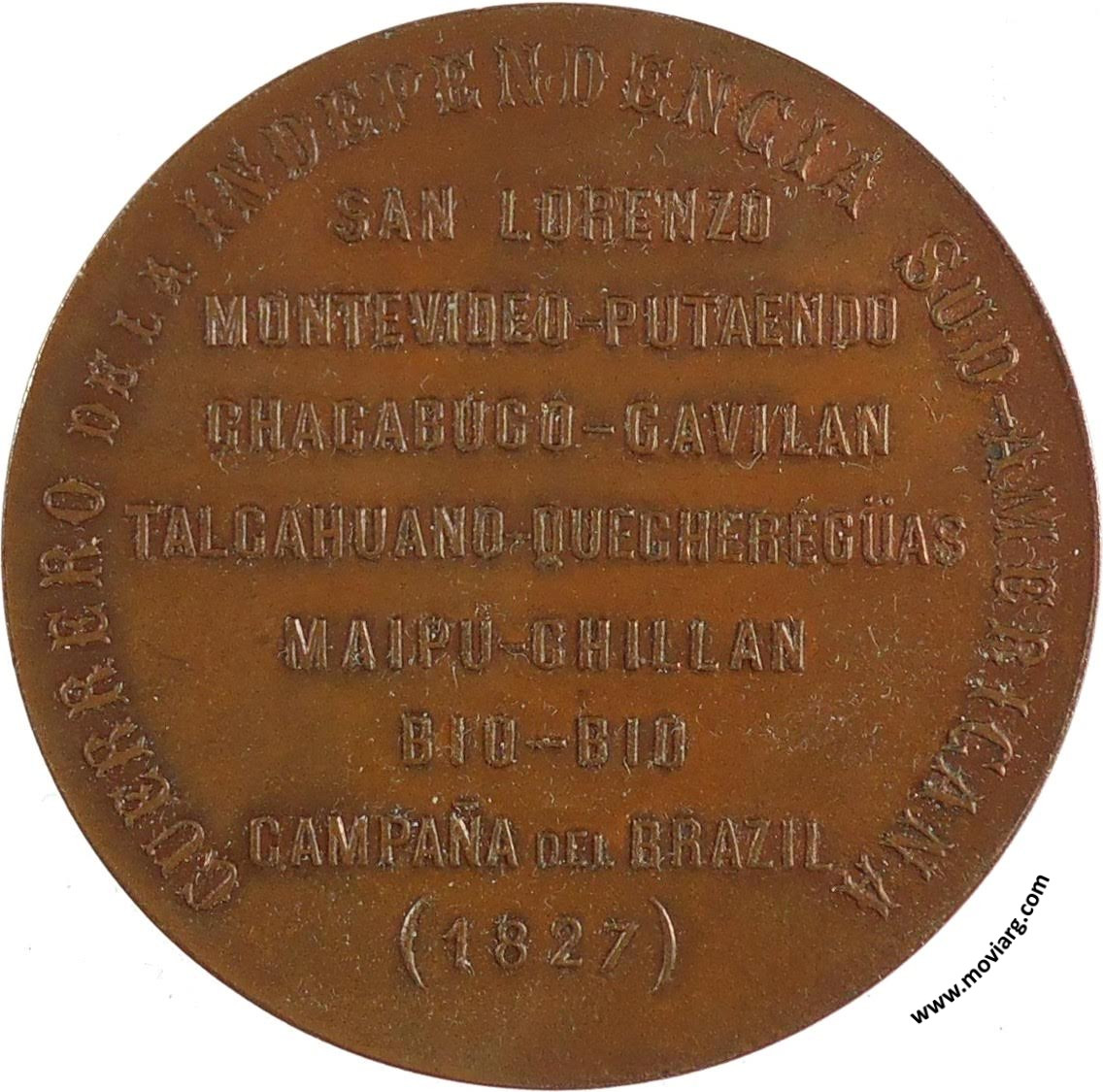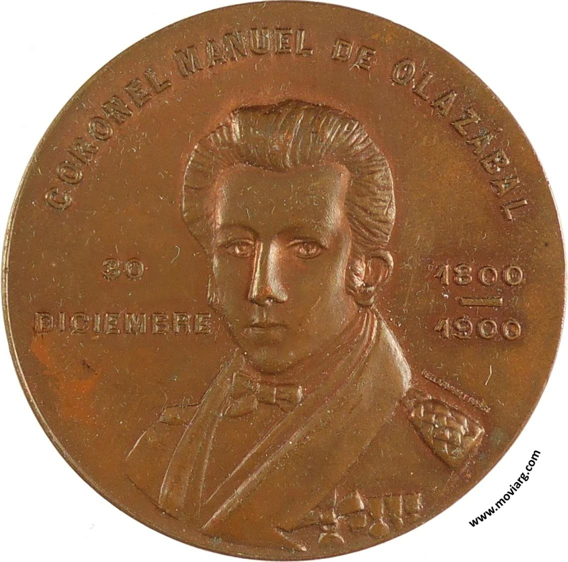 Anverso: CORONEL MANUEL DE OLAZÁBAL / 30 / DICIEMBRE / 1800 / 1900. Firma: BELLAGAMBA Y ROSSI Reverso: GUERRERO DE LA INDEPENDENCIA SUD-AMERICANA / SAN LORENZO / MONTEVIDEO - PUTAENDO / CHACABUCO - GAVILAN / TALCAHUANO - QUECHEREGÜAS / MAIPU - CHILLAN - BIO-BIO / CAMPAÑA DEL BRAZIL / ( 1827 ) Referencia: | |